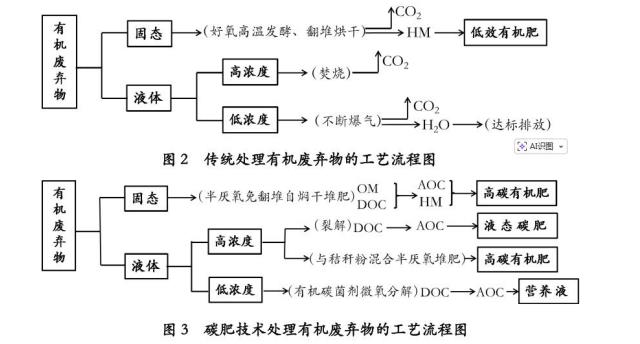 由以上表述可见:不认识碳养分和腐殖化有机质是有机肥特有的有效成分,就是不懂有机肥。一旦把握住有效成分这把钥匙,有机肥的真面目就能揭开。由此而演绎出有机肥制造新工艺的“六字诀”:排变保、大化小。即把旧式排碳工艺变为保碳工艺,把大分子有机碳转化为小分子有机碳。以下是旧新两种工艺对比图:
