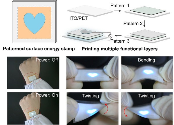 近期,宋延林与李会增等发展出一种基于可编程表面能的“一版多印”印刷策略,实现了利用单一印版印刷制备多层功能器件。他们通过调控印版的表面能,利用不同表面张力的墨滴在印版上选择性地呈现不同润湿状态,从而生成多样化的墨水分布和图案。通过实验验证与理论模拟相结合的手段,证明了该策略能够在单一印版上实现多种图案的精确印刷,大大减少了印版的使用和印刷成本,提高了多材料印刷的对准精度。基于此,研究团队成功印刷了柔性发光器件和高密度晶体管阵列。相比于传统印刷方法需要多个印版来印刷不同图案/材料,该策略通过精确调控表面能,实现了复杂图案和多层器件的单一印版印刷。这一技术不仅提高了印刷效率与套印精度,还为柔性电子、生物传感与显示等领域的创新集成提供了新途径。