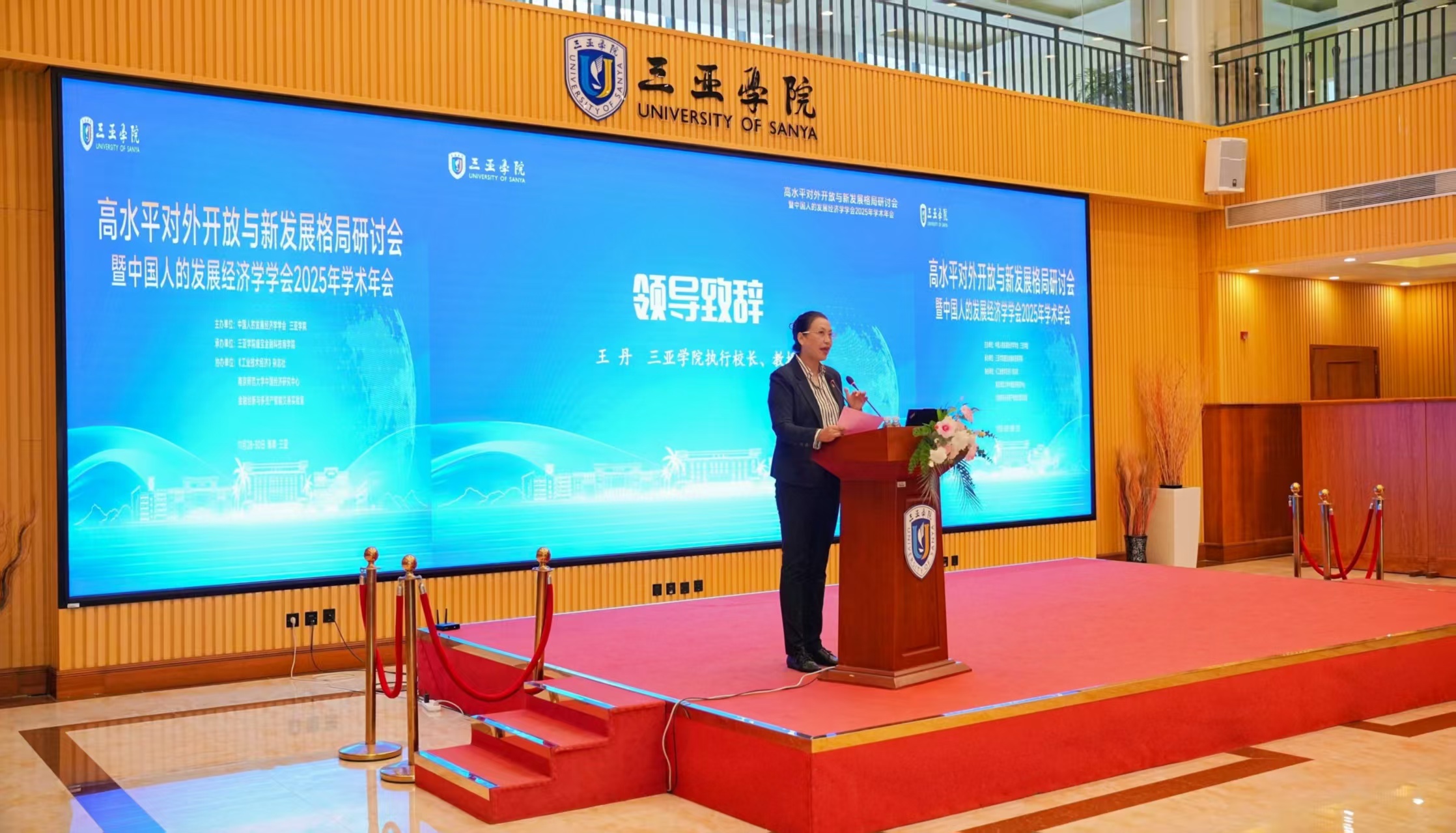 与会专家学者围绕高水平对外开放与中国式现代化、数字经济与人的全面发展、金融高水平开放与国家安全、海南自由贸易港的枢纽作用等13项核心议题展开了深入研讨。海南三亚学院执行校长王丹教授代表三亚学院致欢迎辞。