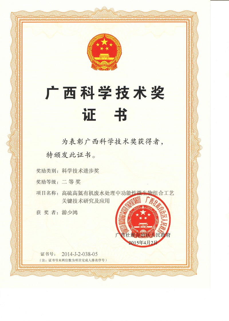 在教学之外,2014年,游少鸿参与的项目“高硫高氮有机废水处理中功能性微生物组合工艺关键技术研究及应用”荣获广西科学技术进步奖二等奖。该项目属于水污染控制技术领域,游少鸿所在的团队结合国家污染物总量控制和节能减排的政策要求,围绕广西千亿元产业框架体系,针对高硫高氮有机废水开展了系列功能性微生物组合工艺关键技术研究及应用。在研究中,首次实现了硫酸盐还原菌-产甲烷菌-无色硫细菌、氨氧化细菌-厌氧氨氧化细菌-有机物氧化细菌等不同类型的功能性微生物在微氧型单一反应器中协同共存;同时构建了新型硫元素循环路径(硫酸盐-硫化物-单质硫)、氮元素转换路径(氨氮-亚硝态氮-氮气)和碳元素循环路径(有机物-二氧化碳-自养型细菌),形成了工业化生产的成套技术及工艺,极大地简化了传统工艺流程。通过此项目,很好地解决了传统工艺处理高硫高氮废水过程中脱硫和有机物甲烷化难以同步进行、厌氧及脱氮效率低和成本高等难题,为国内外特别是广西制糖、酒精等优势产业废水处理提供了有力的技术支撑和保障。
