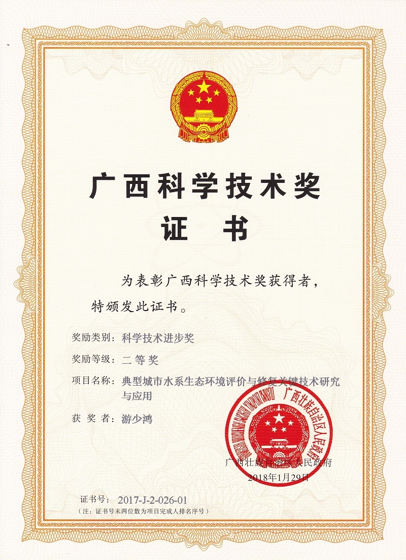 1、典型城市水系生态环境评价与修复关键技术研究与应用,游少鸿; 白少元; 魏建文; 刘立恒; 林华; 莫凌云; 丁彦礼; 王敦球; 王洪强,广西壮族 自治区人民政府, 科技进步, 省部二等奖, 2018.