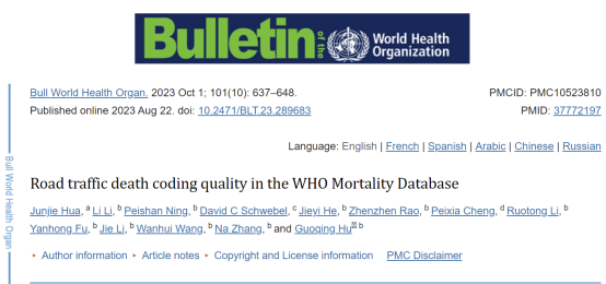 本网讯 10月1日,中南大学湘雅公共卫生学院胡国清教授团队在国际公共卫生权威期刊《世界卫生组织公报》(Bulletin of the World Health Organization)发表题为“世界卫生组织死亡率数据库中的道路交通死亡编码质量(Road traffic death coding quality in the WHO Mortality Database)”的最新研究成果。我校2018级博士华俊杰为论文第一作者,胡国清为该文通讯作者。
