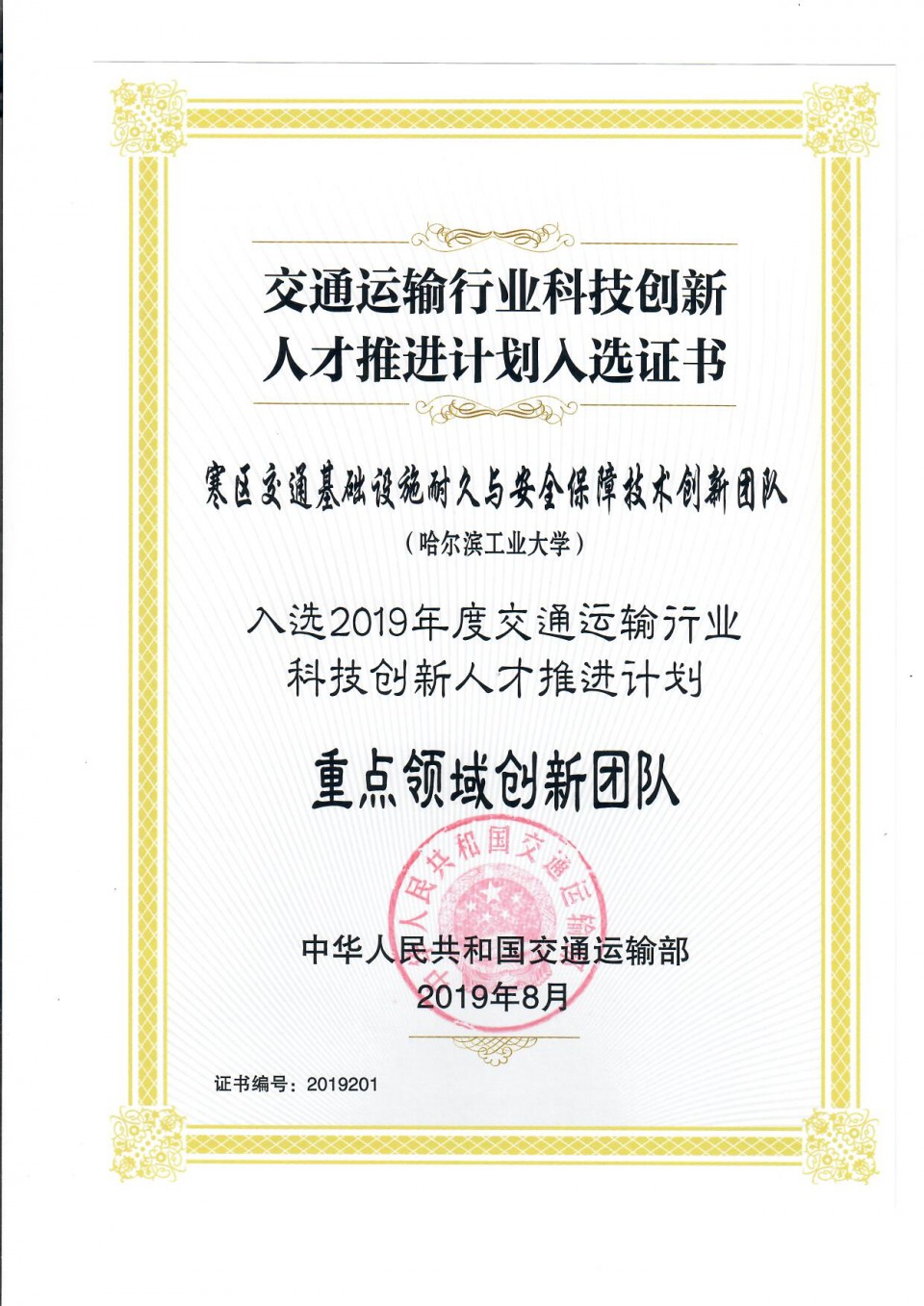 3、2019年 入选交通运输行业科技创新人才推进计划重点领域创新团队--《寒区交通基础设施耐久与安全保障技术创新团队》