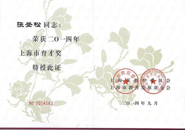 8、2014年,上海市育才奖,张登松,上海市教育委员会、上海市教育发展基金会。