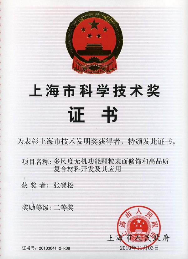 20、多尺度无机功能颗粒表面修饰和高品质复合材料开发及其应用,张剑平; 施利毅; 陈晓东; 孙健; 丁鹏; 杭建忠; 付继芳; 张登松; 方军锋; 杨物华,上海市人民政府, 技术发明奖, 省部二等奖, 2010.