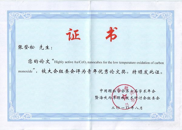 21、Highlyactive Au/CeO2 nanocubes for the low temperature oxidation of carbon monoxide,张登松,中国颗粒学会第七届学术年会暨海峡两岸颗粒技术研讨会组委会, 青年优秀论文奖, -, 2010.