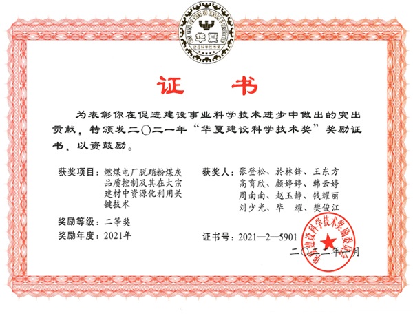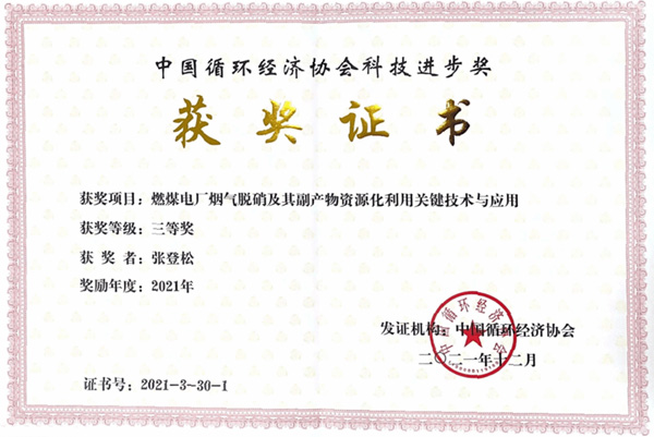 17、2021年中国循环经济协会科技进步三等奖(第一完成人), 煤电厂烟气脱硝及副产物资源化利用。