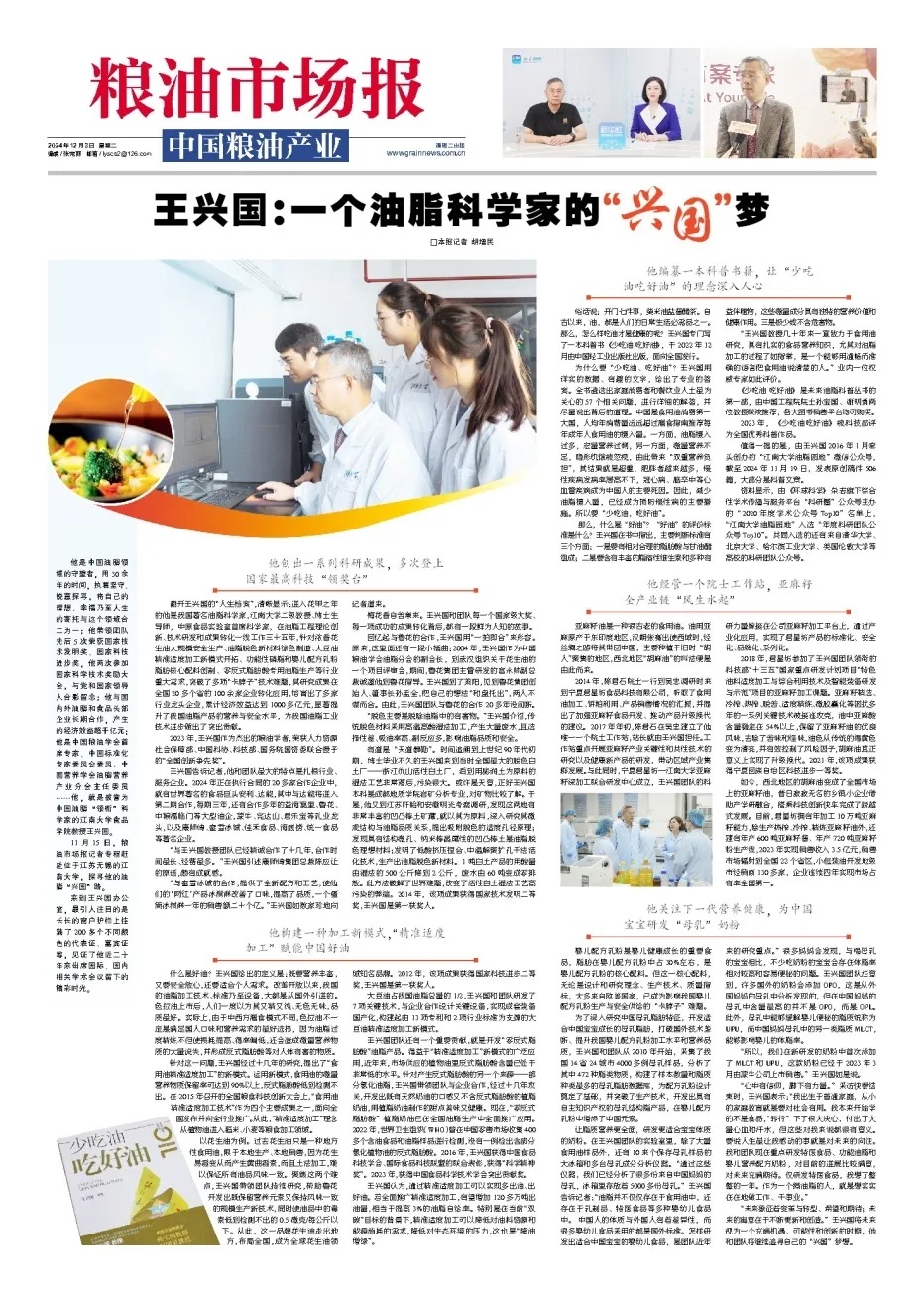 一滴油香,万家烟火。入行这么多年来,王兴国有深切的感悟——如今的油脂不仅是餐桌上的美味,承载着百姓一日三餐的丰盈与满足,更是生活的底色,滋养着民族的体魄与精神,承载着健康与希望的未来。而他的科研理想也很清晰——让科技之光照进人间烟火,在食品工业的经纬中编织一条通向未来的绿色丝路。有梦就有动力,未来的科研路,他还有很多事情要做,包括如何实现食品生产的绿色、低碳、可持续发展,如何实现智能化加工和精准营养等。前路虽远,行则将至;初心如炬,照亮每一滴油的未来。