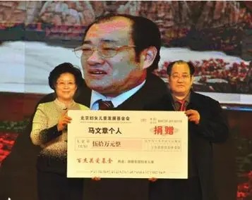 2015年1月20日, 2014海峡两岸暨香港、澳门杰出女企业家爱心公益晚会在北京举行。全国人大常委会原副委员长、中国关工委主任顾秀莲和分别来自大陆等杰出女企业家出席了晚会。晚会上,河南籍榜书书法家马文章,向北京妇女儿童发展基金会“百杰关爱基金”捐助50万元现金,用于贫困地区助学和扶持女性创业就业等爱心活动。同时,马文章还将其曾荣获国际大奖的“寿”“善”两幅作品无偿捐给晚会主办方。第九届全国妇联书记处书记、全国妇女联合会副主席甄砚代表北京妇女儿童发展基金会接收了捐款,全国人大常委会原副委员长、中国关工委主任顾秀莲为马文章颁发了荣誉证书。
