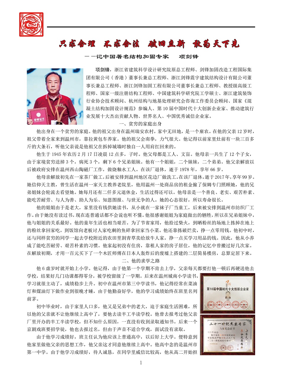 项剑锋高瞻远瞩,锐意进取,自投身到建筑物的结构加固和改造领域后,便始终将技术创新作为自身追求,希望通过努力,让更多的建筑物通过加固和改造延续其使用寿命。