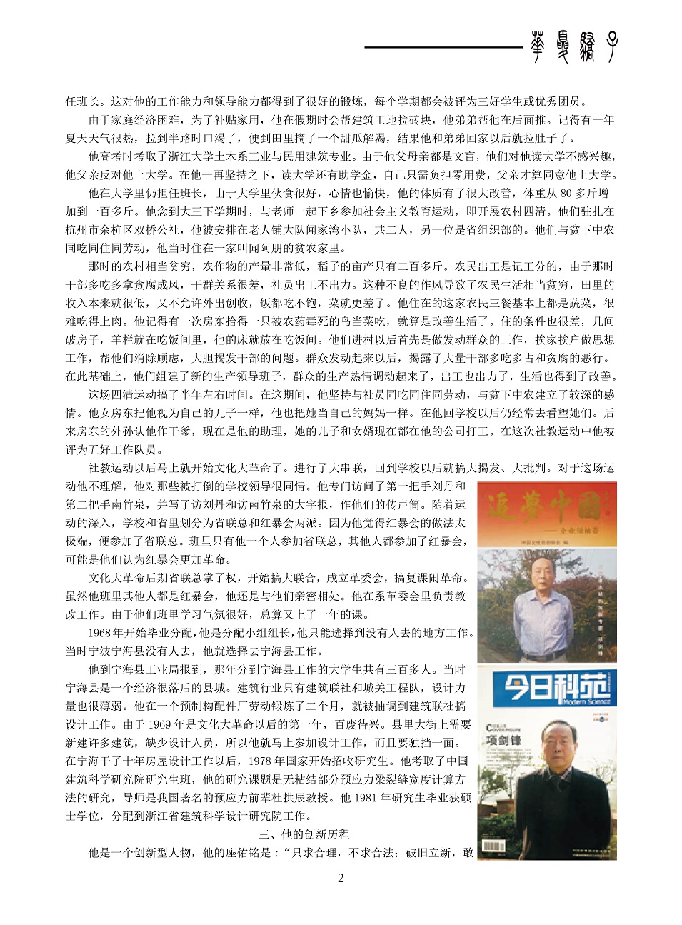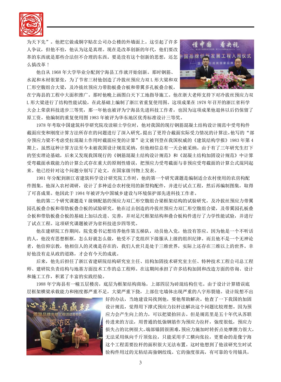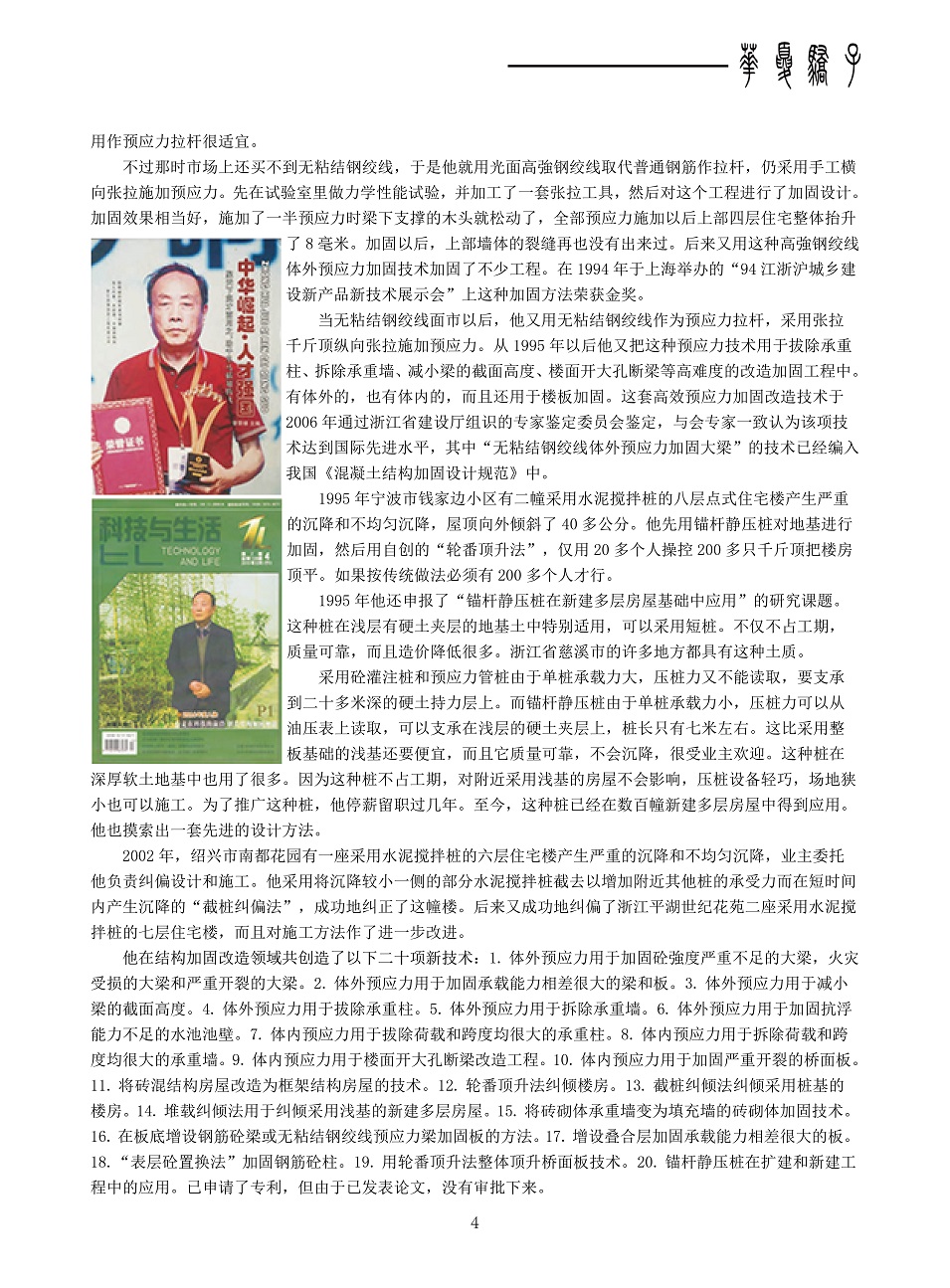 自1988年开始便从事建筑物加固、改造方面的咨询、设计和施工工作。在20余年的工作实践中,积累了丰富的实践经验,拥有20项自主创新技术。在中国科技报研究会主办的《科学中国人》期刊中,被誉为我国结构加固领域的领军人物。