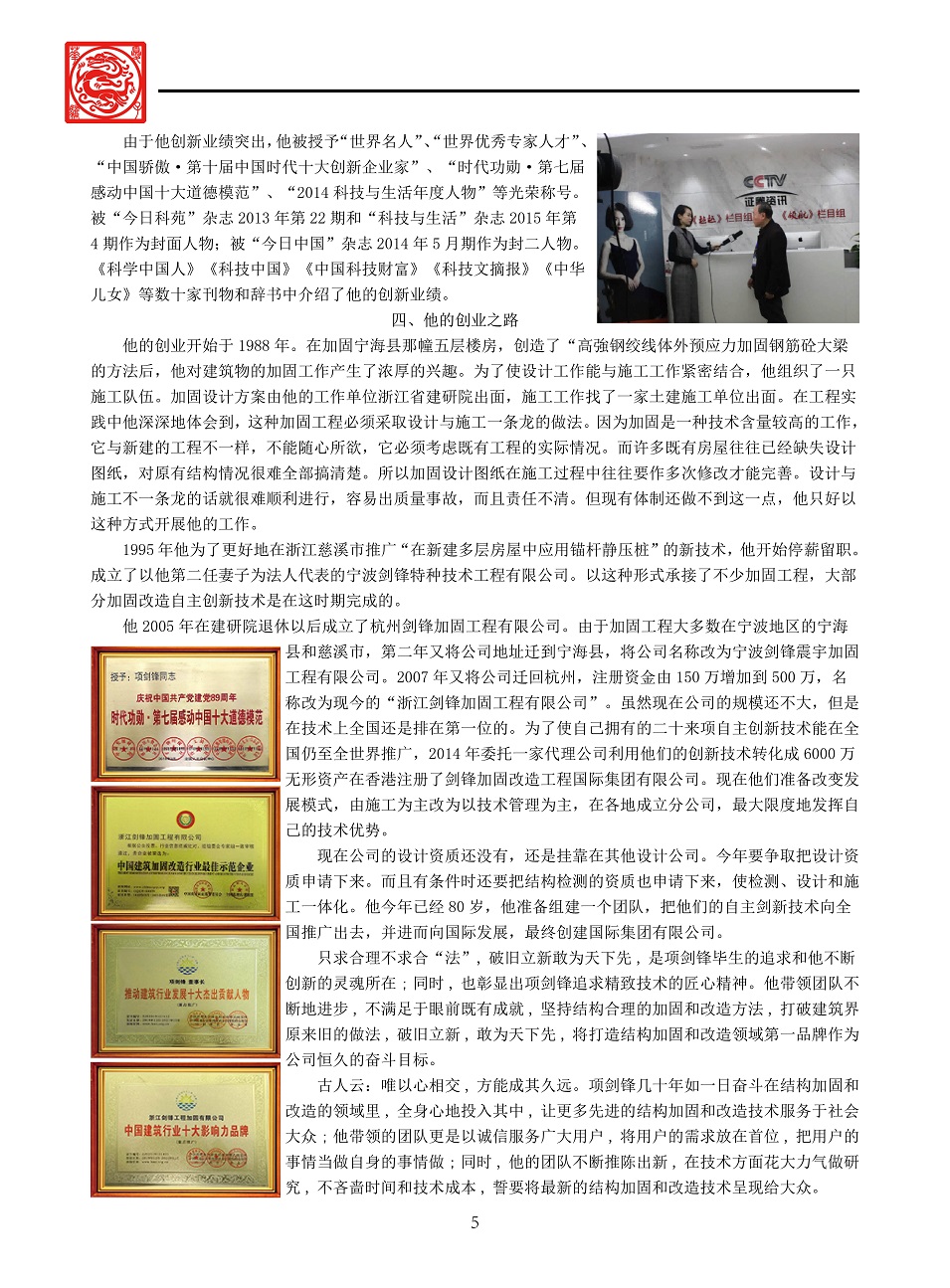 2018年1月5日,浙江剑锋加固工程有限公司董事长项剑锋受邀参加CCTV证券资讯频道特别节目《机遇》栏目选题,顺利入围“中国品牌创新发展工程”。