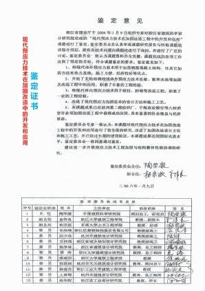 这种加固方法94年在上海举办的“94`江、浙、沪城乡建设新产品、新技术展示会”上荣获金奖。介绍该技术的论文1994年被收入《中国实用科技成果大辞典》中,1996年被《后张预应力砼设计手册》(中国建筑工业出版社出版,陶学康主编)收入《工程应用篇》中,1998年被收入《中国土木工程学会第八届年会论文集》中,并应邀在第八届年会上作大会交流。