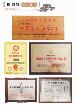 百分努力的付出,终会赢得社会认可。作为教授级高级工程师和国家一级注册结构工程师的项剑锋,在一次次不断地自主研发创造过程中,收获了诸多荣誉,他被授予“世界名人”、“中国骄傲•第10届中国时代十大创新企业家”、推动建筑业发展十大杰出贡献人物等,荣誉称号。