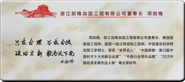 只求合理不求合“法”,破旧立新敢为天下先,是项剑锋毕生的追求和他不断创新的灵魂所在;同时,也彰显出项剑锋追求精致技术的匠心精神。他带领团队不断地进步,不满足于眼前既有成就,坚持建筑合理的加固和改造方法,打破建筑界原来旧有的做法,破旧立新,敢为天下先,将打造结构加固和改造领域第一品牌作为公司恒久的奋斗目标。